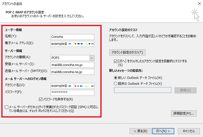 | ・ユーザー情報 名前:任意で決めます。(メールを送信時相手に差出人として表示されます。) 電子メールアドレス:設定するメールアドレスを入力します。(@以降も含め全部) ・サーバー情報 アカウントの種類:「POP3」か「IMAP」を任意で選択します。 受信メールサーバー:mail88.conoha.ne.jpを入力します。 送信メールサーバー:mail88.conoha.ne.jpを入力します。 ・メールサーバーへのログオン情報 アカウント名:メールアドレスを入力します。(@以降も含め全部) パスワード:メールアドレスのパスワードを入力します。 ※「パスワードを保存する」にチェックを入れるとメール送受信の際にパスワードの入力が不要となります。 メールサーバーがセキュリティで保護されたパスワード認証(SPA)に対応している場合には、チェック ボックスをオンにしてください:チェックを入れます。 |