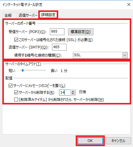 | サーバーのポート番号 受信サーバー: ・アカウントの種類でPOPを選択しており、「このサーバーは暗号化された接続(SSL)が必要」チェックしない場合→110 ・アカウントの種類でPOPを選択しており、「このサーバーは暗号化された接続(SSL)が必要」チェックする場合→995 ・アカウントの種類でIMAPを選択しており、「このサーバーは暗号化された接続(SSL)が必要」チェックしない場合→143 ・アカウントの種類でIMAPを選択しており、「このサーバーは暗号化された接続(SSL)が必要」チェックする場合→993 送信サーバー: ・「使用する暗号化接続の種類」のプルダウンで「SSL」を選択する場合→465 ・「使用する暗号化接続の種類」のプルダウンで「SSL」を選択しない場合→587 ・サーバーのタイムアウト→デフォルトのままで問題ありません。受信件数多い等通信に時間がかかりエラーとなる際に長くすることで解消するケースがあります。 ・配信→ご運用にあわせて設定をします。 |